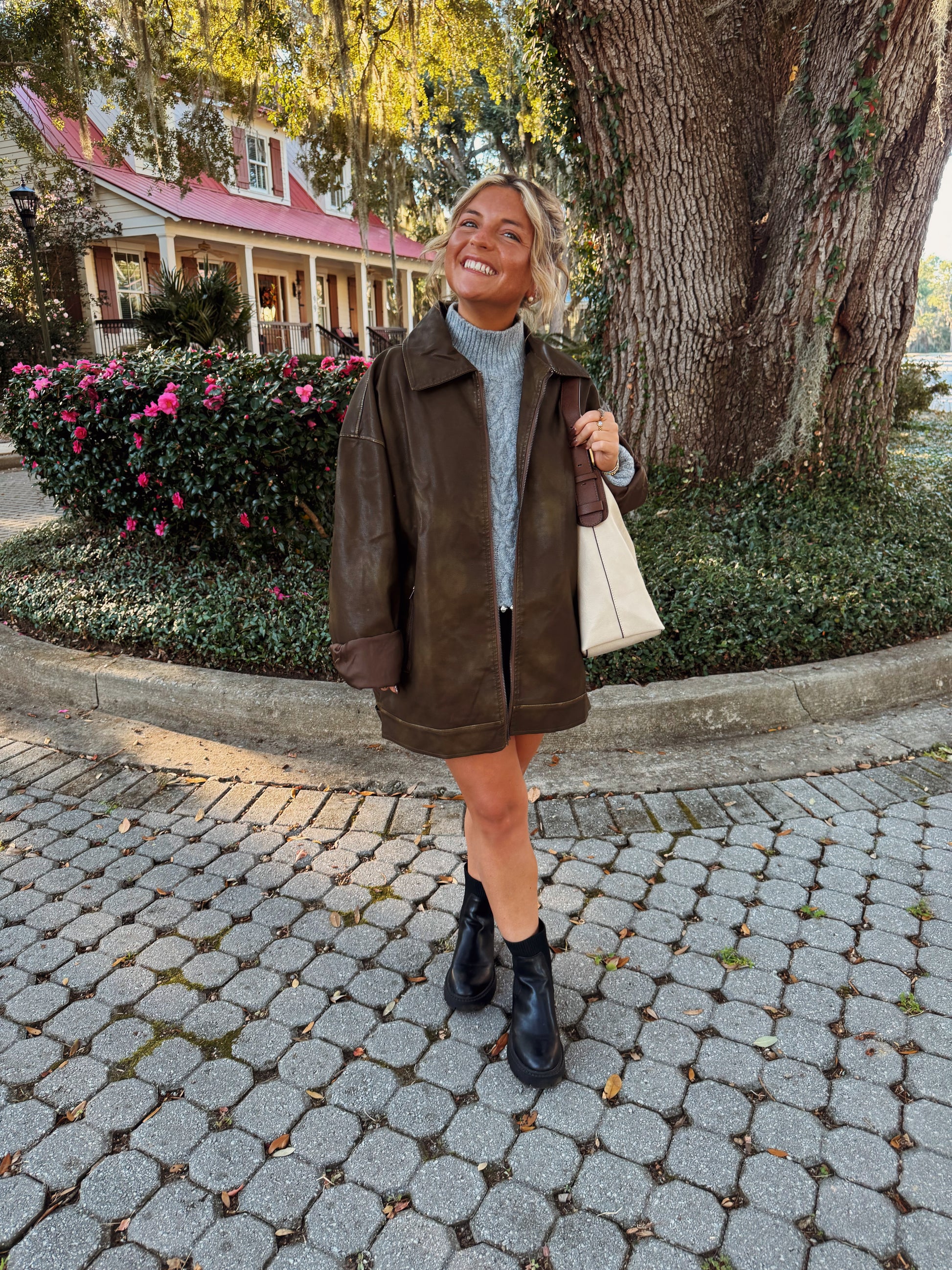 This faux leather oversized jacket has a collared neck and zips down. Its has pockets on both sides and is perfect for layering. It is very a versatile piece that is worth every penny.