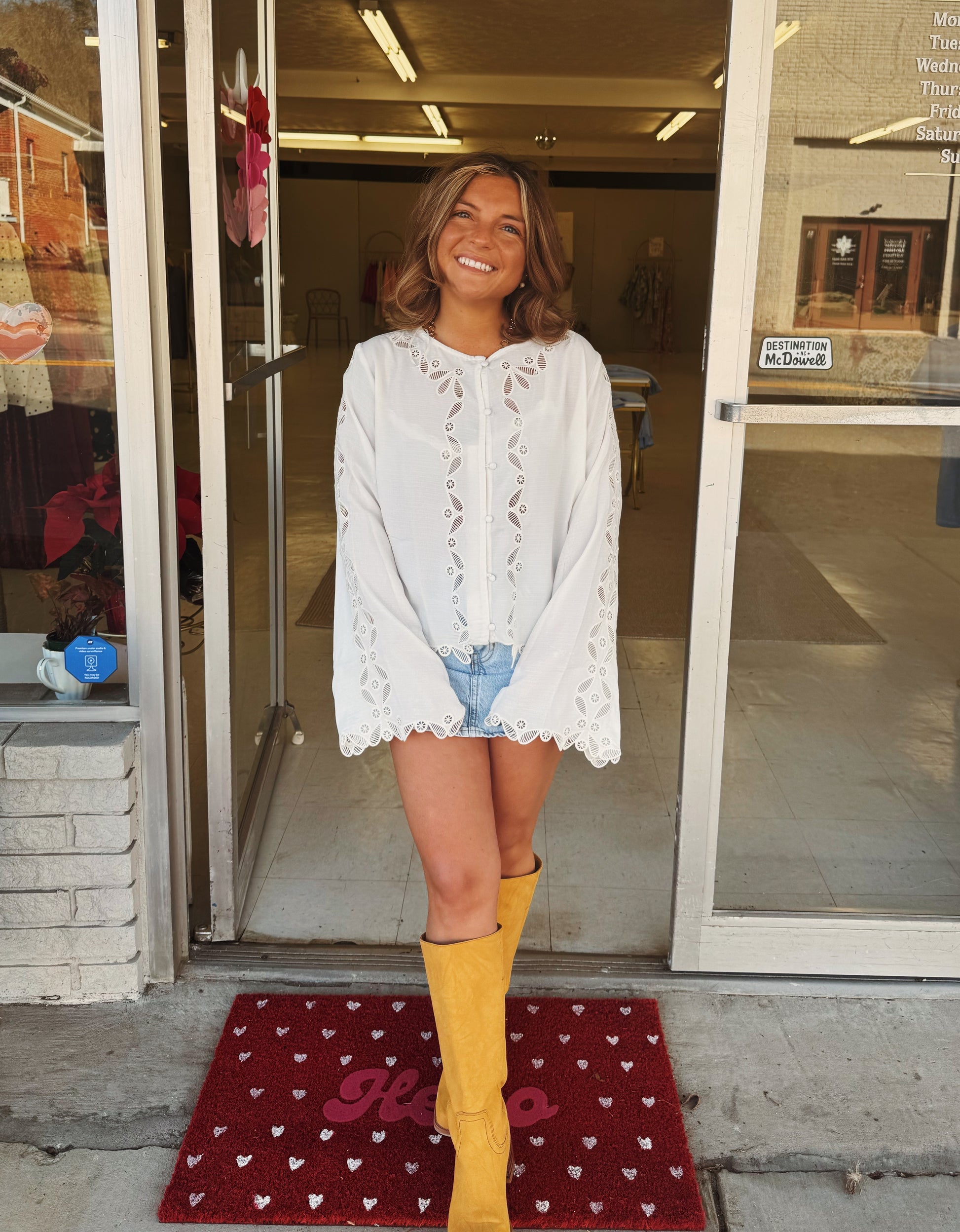 This is a delicate ivory colored long-sleeve blouse that features an intricate scalloped lace embroidery along the front, sleeves, and hem. Made from a lightweight, semi-sheer fabric. This top includes a round neckline and fabric-covered buttons down the front, adding a "vintage" inspired touch.